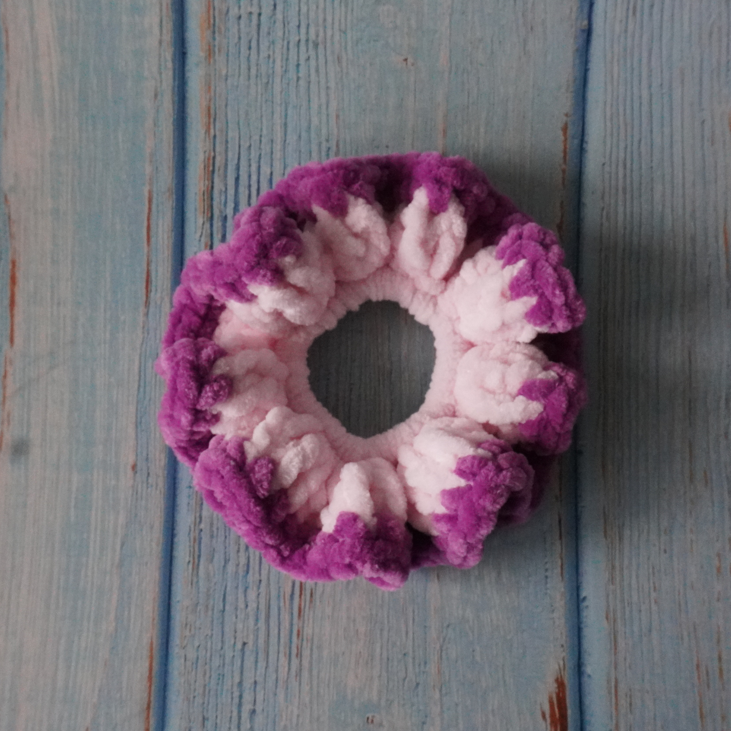 Gehaakte scrunchies in paarse en roze tinten